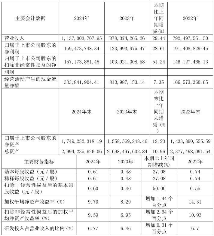 中证智能财讯兴福电子(688545)4月1日披露2024年年度报告。2024年,公司实现营业总收入11.37亿元,同比增长29.44%;归母净利润1.59亿元,同比增长28.61%;扣非净利润1.57亿元,同比增长51.24%;经营活动产生的现金流量净额为3.34亿元,同比增长7.35%;报告期内,兴福电子基本每股收益为0.61元,加权平均净资产收益率为9.73%。公司2024年度分配预案为:拟向全体股东每10股派现2元(含税)。