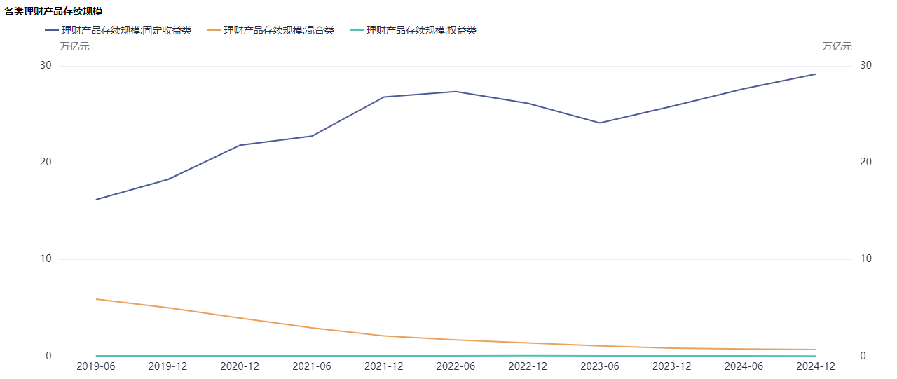 但是,由于银行理财子公司投资团队侧重固收类资产投资研究,近年涉足权益类投资的理财产品规模不高。今年1月,银行业理财登记托管中心发布的《中国银行业理财市场年度报告(2024年)》显示,截至去年底,固定收益类产品存续规模达到29.15万亿元,在全部理财产品存续规模的占比达到约97%;权益类理财产品的存续规模仅有600亿元。