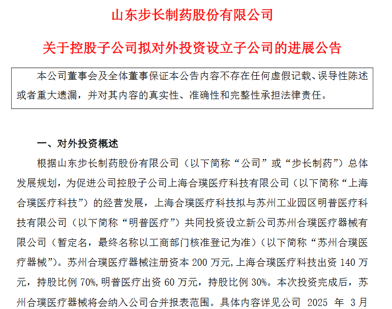 步长制药近期不断发布拟投资设立控股子公司的进展公告。3月24日,公司公告,为促进公司控股子公司上海合璞医疗科技有限公司的经营发展,上海合璞医疗科技拟与苏州工业园区明普医疗科技有限公司共同投资设立新公司苏州合璞医疗器械有限公司(暂定名,最终名称以工商部门核准登记为准)。此前,公司于2024年11月22日、12月6日和2025年1月8日分别召开董事会会议,审议通过了设立三家控股子公司的议案,分别为出资93万元设立步长众福寿药业有限公司、出资450万元设立山东步长冠优医疗器械有限公司和出资450万元设立山东步长臻泽医药科技有限公司。济南步长众福商贸有限公司、山东步长冠优医疗器械有限公司、山东步长臻泽医药科技有限公司已完成工商登记注册手续,并取得莱芜高新技术产业开发区市场监督管理局核发的营业执照。