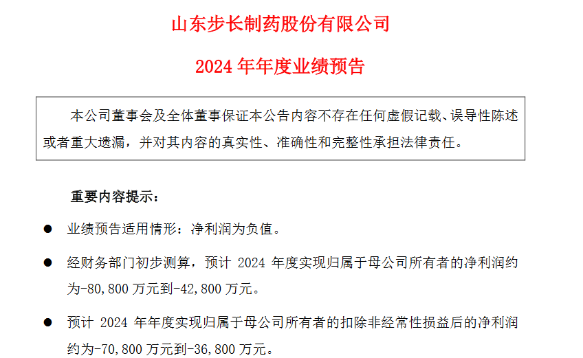 步长制药1月20日发布2024年度业绩预告,经财务部门初步测算,预计公司2024年度实现归属于母公司所有者的净利润约为亏损4.28亿元到8.08亿元;公司预计2024年年度实现归属于母公司所有者的扣除非经常性损益后的净利润约为-7.08亿元到-3.68亿元。步长制药在公告中解释称,预计年度本期巨亏的主要原因是商誉减值事项。按照谨慎性原则,公司财务部门对子公司通化谷红、吉林天成商誉进行减值测试,拟计提商誉减值准备合计约7亿元到10亿元。此外,业绩预亏的其他原因,还在于部分产品因医保受限或被部分省份纳入重点监控目录使得销量减少,导致本年部分产品收入较上年减少,产品收入结构发生变动,总体毛利率下降。