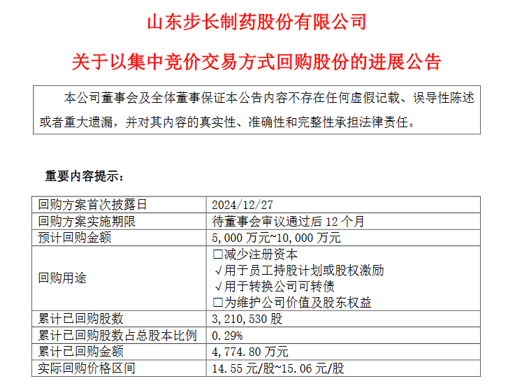 4月1日晚间,步长制药(603858)发布以集中竞价交易方式回购股份的进展公告。2025年3月,公司通过集中竞价交易方式累计回购股份 102万股,占公司总股本的比例为 0.09%,购买的最高价为 15.06 元/股、最低价为 14.90 元/股,累计支付的金额为 1531万元。截至2025年3月31日,公司通过集中竞价交易方式已累计回购公司股份321万股,已回购股份占公司总股本的比例为0.29%,购买的最高价为 15.06元/股,最低价为14.55元/股,累计已支付的总金额为4774万元。