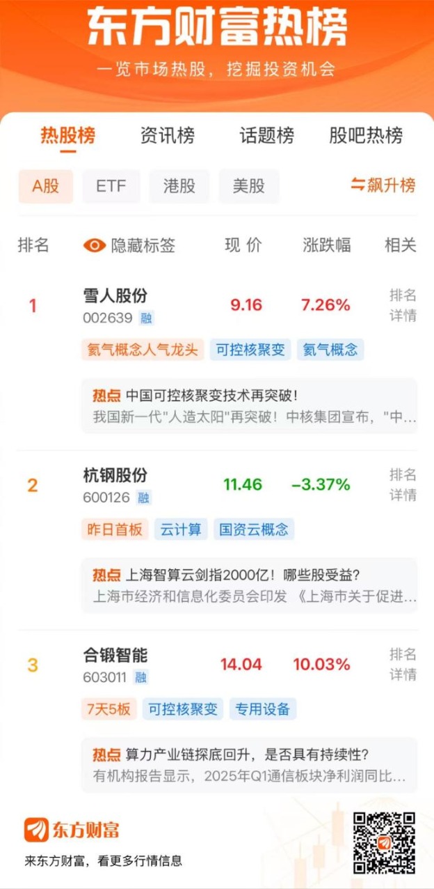 4月1日,两市震荡分化,三大指数涨跌不一。东方财富热股榜前三的股票中,雪人股份位列第1,杭钢股份位列第2,合锻智能位列第3。