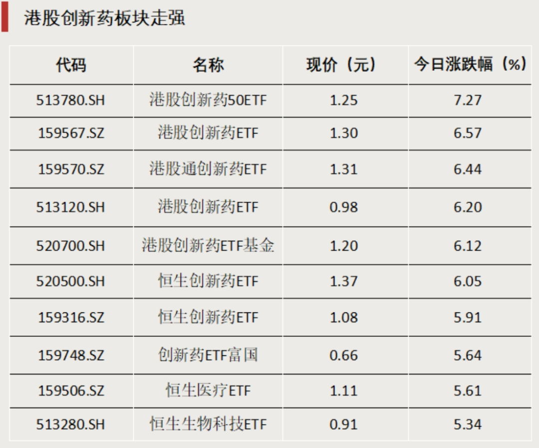 今日,医药板块大涨,多只医药股冲上涨停。ETF方面,多只港股创新药主题ETF涨幅超6%,其中最高涨幅达7.27%。此外,红利板块也迎来明显涨幅,多只红利、煤炭、电力等主题的ETF单日涨幅超1%。