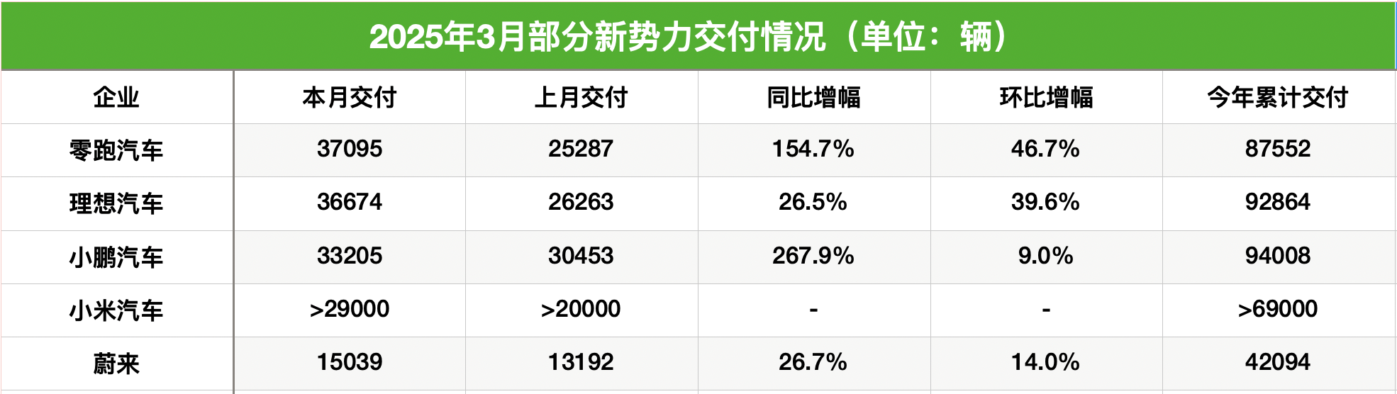 紧随其后的是理想汽车。数据显示,3月,理想汽车交付新车36674辆,同比增长26.5%。2025年第一季度共计交付92864辆新车,同比增长15.5%。截至2025年3月31日,理想汽车历史累计交付量为1226736辆。