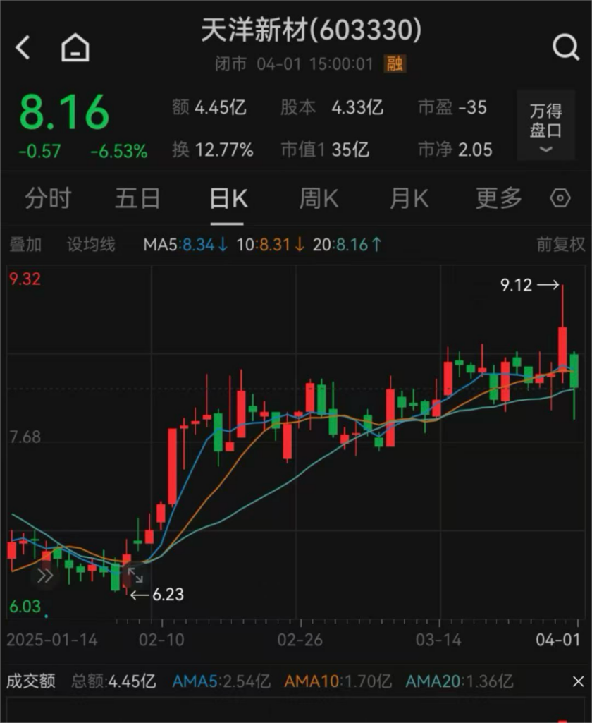 截至4月1日收盘,天洋新材每股报8.16元,下跌6.53%,最新市值为35亿元。
