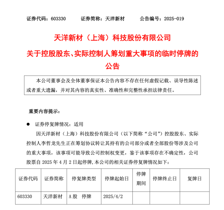 4月1日,天洋新材发布公告称,公司于当日收到公司控股股东、实际控制人李哲龙的通知,获悉李哲龙正在筹划协议转让其持有的公司部分或者全部股份等涉及公司的重大事项,该事项可能导致公司控制权发生变更。