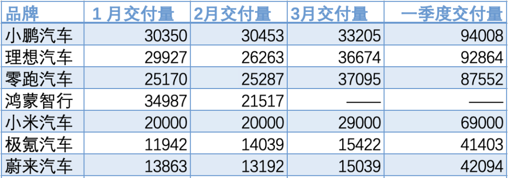 4月1日,多家造车新势力先后发布3月交付量数据。零跑汽车成为“最强黑马”夺下新势力月销量榜单冠军,理想、小鹏位列第二、第三名。截至1日21时,华为旗下鸿蒙智行则还未发布交付数据。
