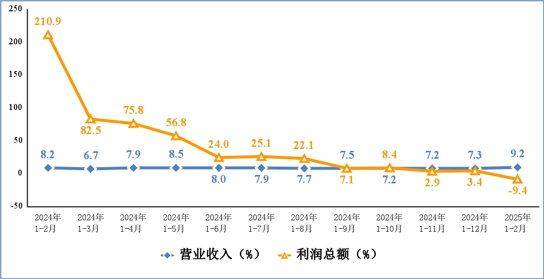 1-2月,规模以上电子信息制造业实现营业收入2.32万亿元,同比增长9.2%;营业成本2.06万亿元,同比增长9.6%;实现利润总额387亿元,同比下降9.4%;营业收入利润率为1.67%。