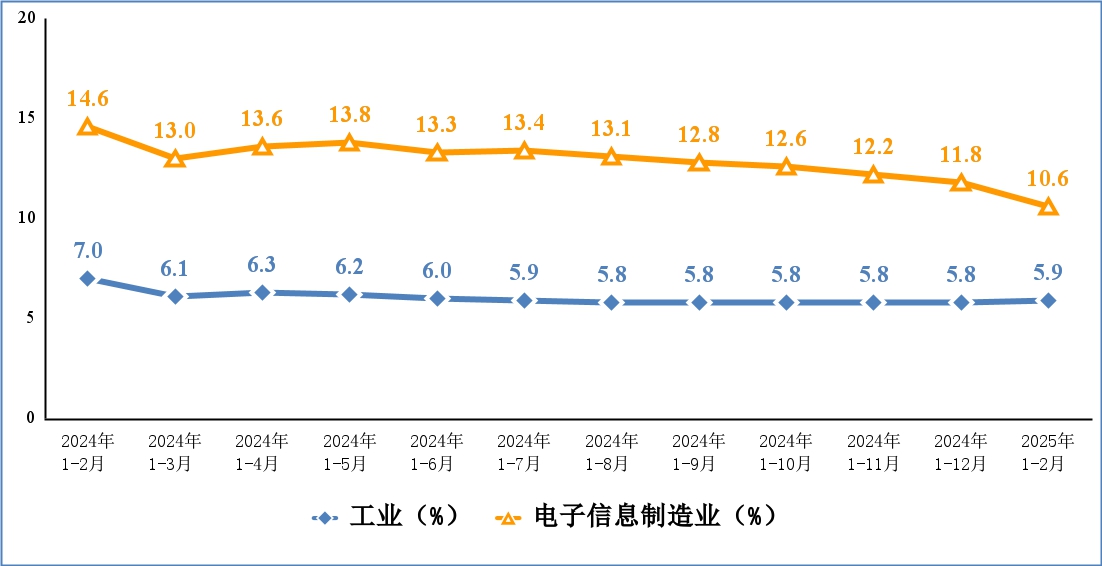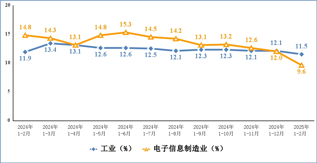 1-2月,电子信息制造业固定资产投资同比增长9.6%,较2024年回落2.4个百分点,比同期工业投资增速低1.9个百分点,比同期高技术制造业投资增速高9.6个百分点。