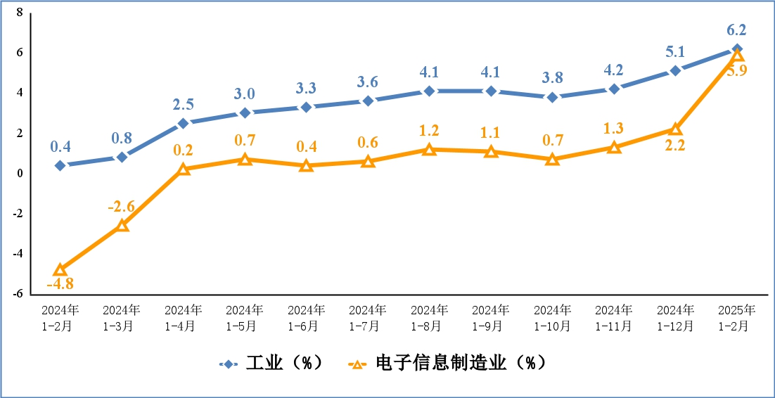 1-2月,规模以上电子信息制造业累计实现出口交货值同比增长5.9%,较2024年提高3.7个百分点。