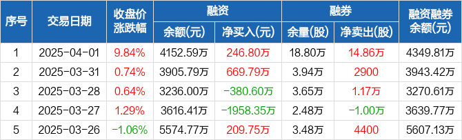 融资方面,当日融资买入3608.71万元,融资偿还3361.91万元,融资净买入246.8万元。融券方面,融券卖出16.36万股,融券偿还1.5万股,融券余量18.8万股,融券余额197.21万元。融资融券余额合计4349.81万元。