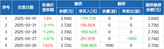 融资方面,当日融资买入518.9万元,融资偿还1310万元,融资净偿还791.11万元。融券方面,融券卖出0股,融券偿还0股,融券余量0股,融券余额0元。融资融券余额合计2.64亿元。