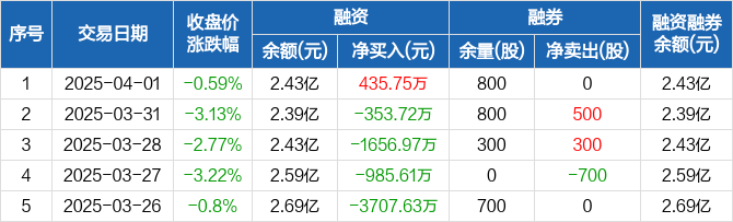 融资方面,当日融资买入1553.19万元,融资偿还1117.44万元,融资净买入435.75万元。融券方面,融券卖出0股,融券偿还0股,融券余量800股,融券余额2704元。融资融券余额合计2.43亿元。