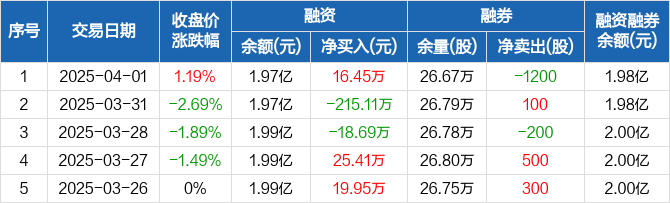 融资方面,当日融资买入345.98万元,融资偿还329.53万元,融资净买入16.45万元。融券方面,融券卖出100股,融券偿还1300股,融券余量26.67万股,融券余额68.28万元。融资融券余额合计1.98亿元。