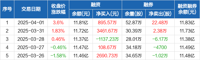 融资方面,当日融资买入1.37亿元,融资偿还1.28亿元,融资净买入895.57万元。融券方面,融券卖出28.33万股,融券偿还5.85万股,融券余量52.87万股,融券余额243.2万元。融资融券余额合计11.83亿元。
