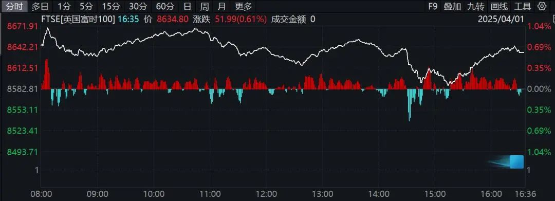 欧洲三大主要股指全线上涨,德国DAX指数尾盘走高,收涨1.7%,法国CAC40指数涨超1%,英国富时100指数收涨0.61%。