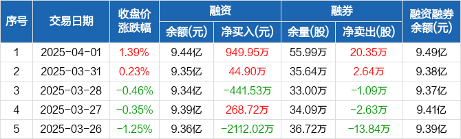 融资方面,当日融资买入2710.51万元,融资偿还1760.56万元,融资净买入949.95万元。融券方面,融券卖出21.49万股,融券偿还1.14万股,融券余量55.99万股,融券余额489.35万元。融资融券余额合计9.49亿元。