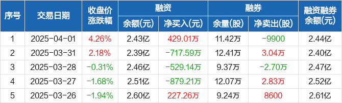 融资方面,当日融资买入5772.87万元,融资偿还5343.86万元,融资净买入429.01万元。融券方面,融券卖出0股,融券偿还9900股,融券余量11.42万股,融券余额78.23万元。融资融券余额合计2.44亿元。