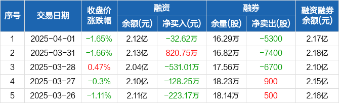 融资方面,当日融资买入1391.84万元,融资偿还1424.46万元,融资净偿还32.62万元。融券方面,融券卖出2500股,融券偿还7800股,融券余量16.29万股,融券余额475.99万元。融资融券余额合计2.17亿元。