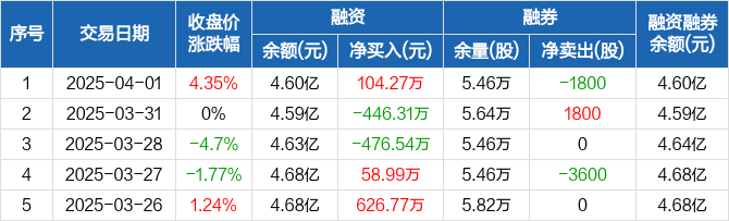融资方面,当日融资买入1042.54万元,融资偿还938.27万元,融资净买入104.27万元。融券方面,融券卖出0股,融券偿还1800股,融券余量5.46万股,融券余额39.26万元。融资融券余额合计4.6亿元。