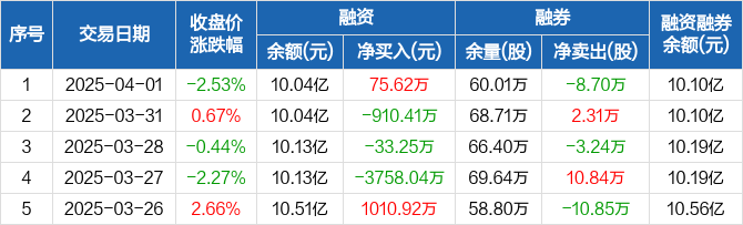 融资方面,当日融资买入7555.69万元,融资偿还7480.07万元,融资净买入75.62万元。融券方面,融券卖出5500股,融券偿还9.25万股,融券余量60.01万股,融券余额531.09万元。融资融券余额合计10.1亿元。