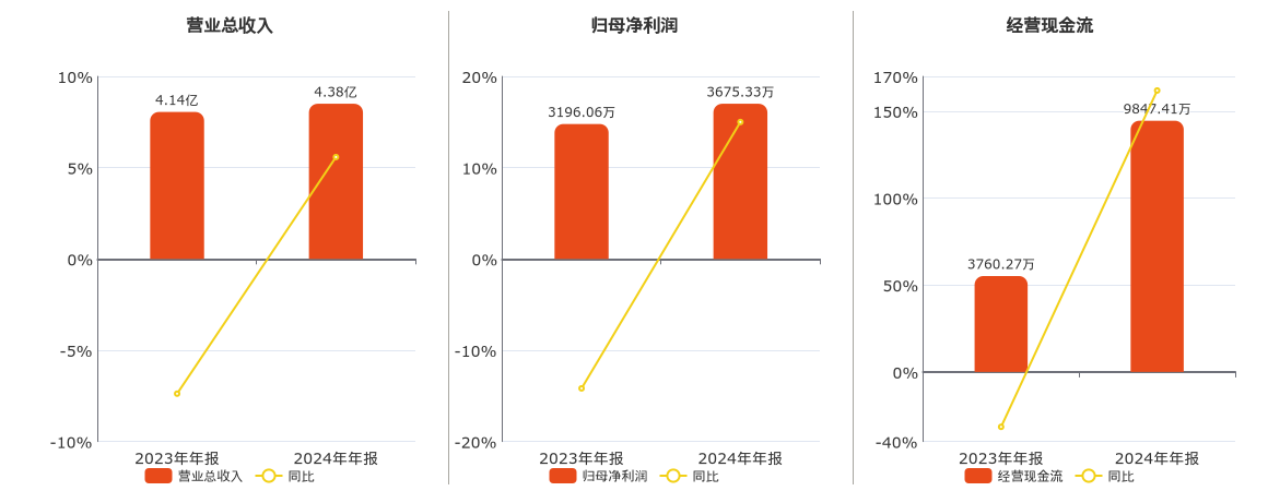 公司营业总收入为4.38亿元。归母净利润为3675.33万元。经营活动现金净流入为9847.41万元。