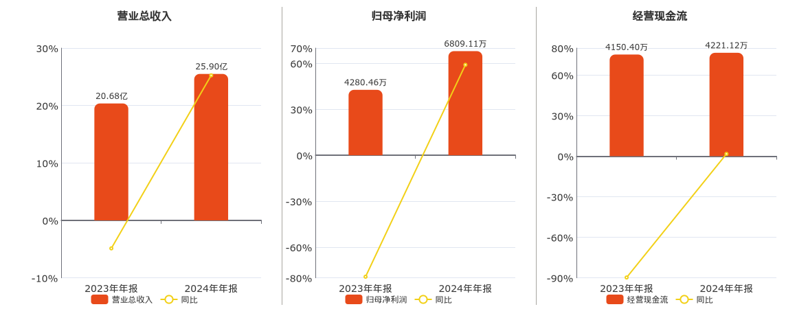 公司营业总收入为25.90亿元。归母净利润为6809.11万元。经营活动现金净流入为4221.12万元。