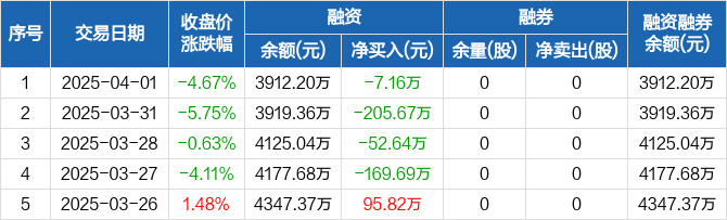 融资方面,当日融资买入144.75万元,融资偿还151.91万元,融资净偿还7.16万元,连续4日净偿还累计435.17万元。融券方面,融券卖出0股,融券偿还0股,融券余量0股,融券余额0元。融资融券余额合计3912.2万元。