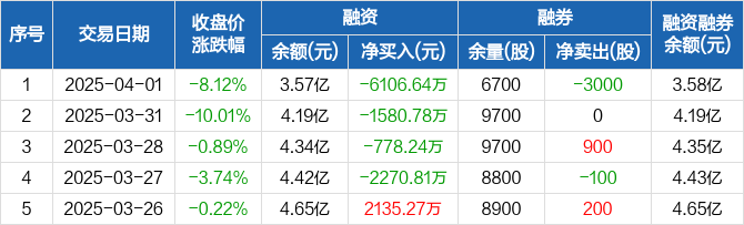 钧达股份融资融券信息显示,2025年4月1日融资净偿还6106.64万元;融资余额3.57亿元,较前一日下降14.59%