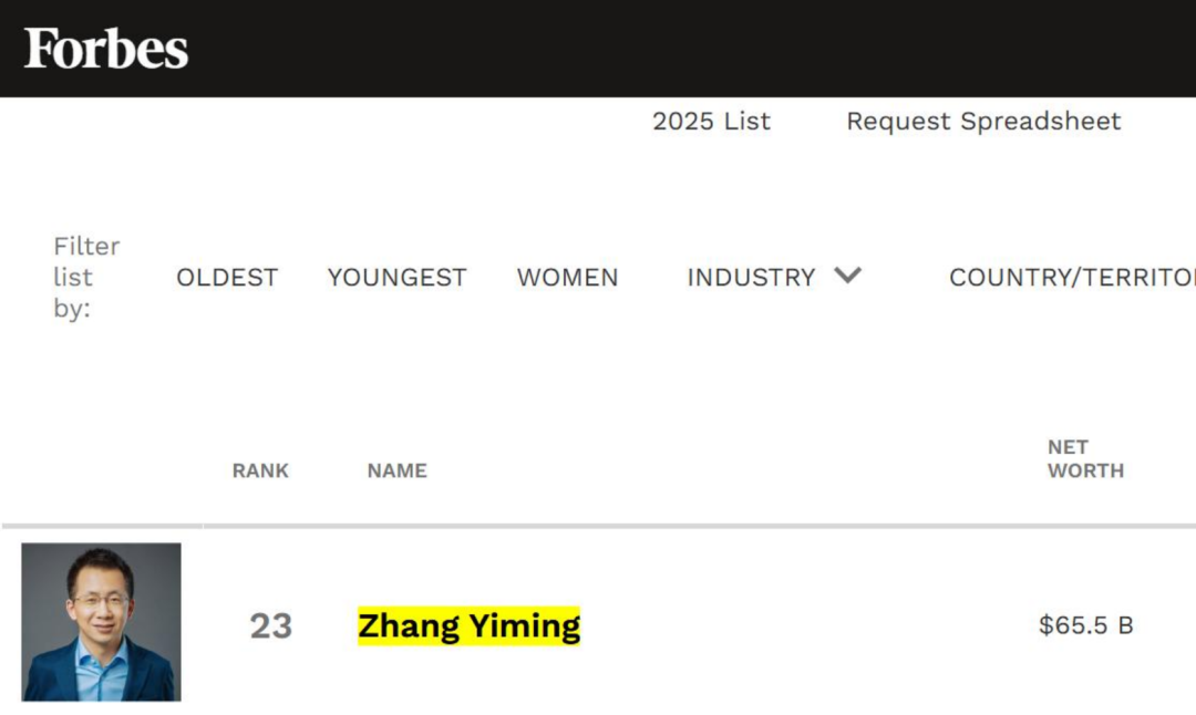 福布斯预估张一鸣身家为655亿美元,在全球富豪榜位列第23位,马化腾与钟睒睒分列富豪榜第27和28位。