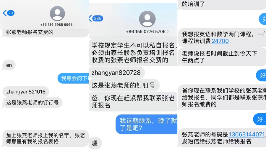 还有家长反映,在收到上述短信同时,还会收到另一条自称是学校领导的短信。在这条短信里,对方“证实”有名师培训一事,以打消家长的疑虑;有的还会继续发送学生姓名及身份证号等信息,进一步获取家长信任。如果家长信以为真,对方就会推荐名叫“教导处张燕”的老师,要求家长添加其QQ或钉钉,由张老师发送收款码或银行账号。