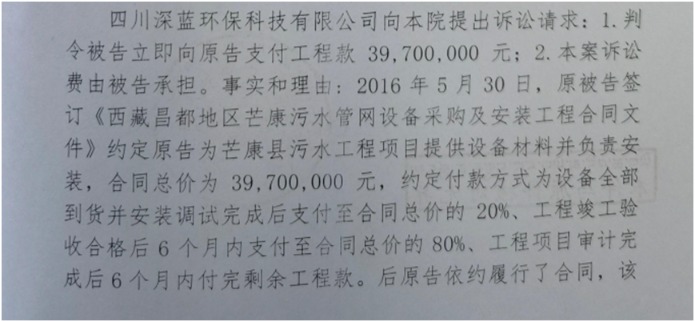 西藏昌都地区芒康污水管网工程。2016年5月30日,佳和建设与深蓝环保签订《西藏昌都地区芒康污水管网设备采购及安装工程合同文件》,约定原告为芒康县污水工程项目提供设备材料并负责安装,合同总价为3970万元,工程款均未支付。
