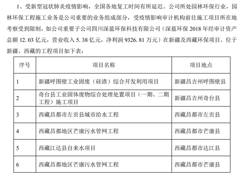 上述项目在普邦股份的公告中曾多次出现。2020年4月25日,普邦股份公告推迟发布2019年年报,原因是受疫情影响,审计机构前往施工项目所在地考察受到限制,其中特别列出了深蓝环保涉及西藏的四个项目,包括西藏昌都市左贡县城市给水工程、西藏昌都地区芒康污水管网工程、西藏江达县自来水项目、西藏昌都地区芒康污水管网工程。
