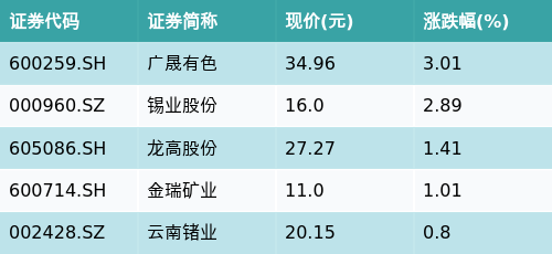 截至收盘,稀缺资源主题涨跌幅最高的五只股票为:广晟有色(600259.SH)、锡业股份(000960.SZ)、龙高股份(605086.SH)、金瑞矿业(600714.SH)与云南锗业(002428.SZ)。详情见下表: