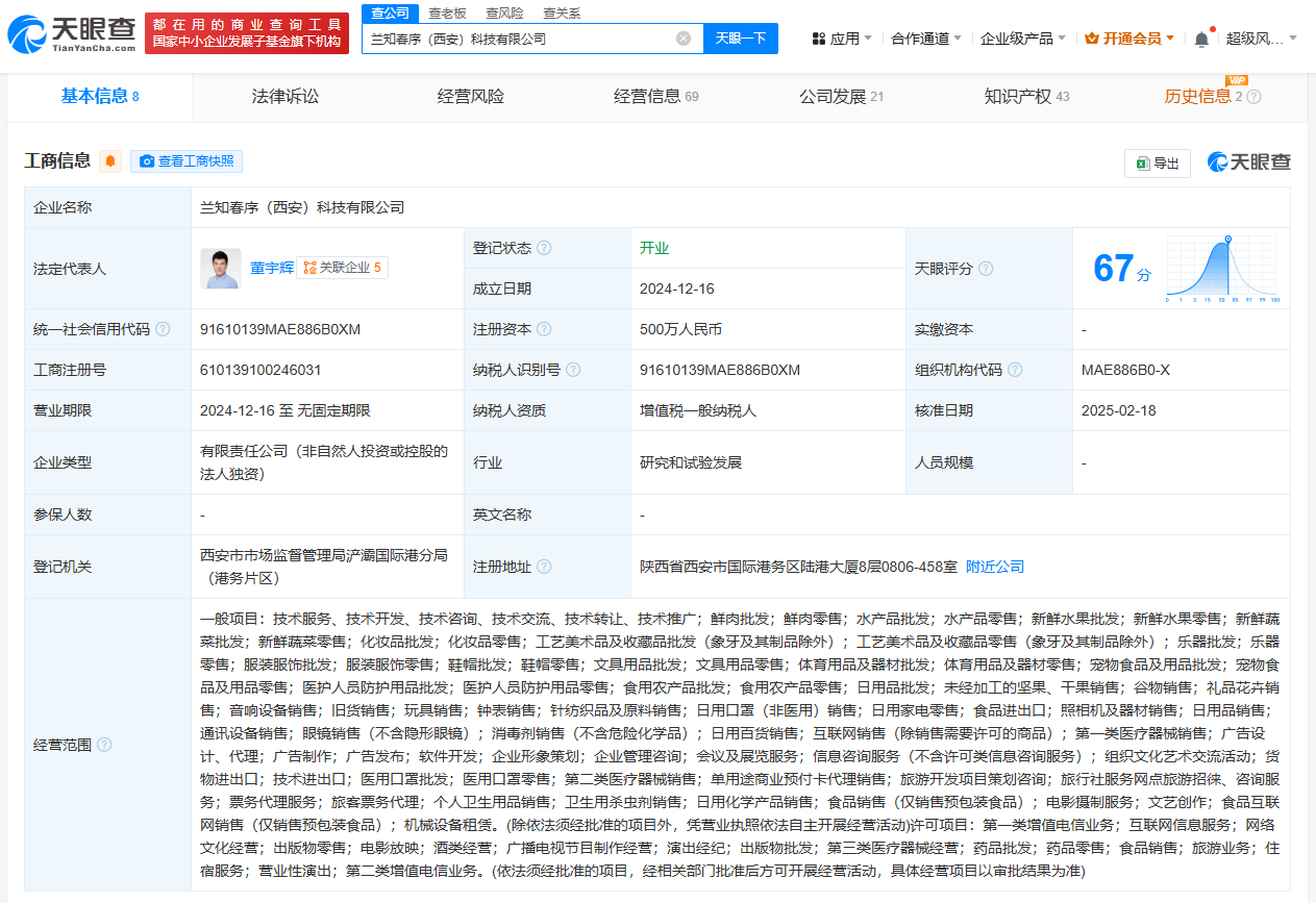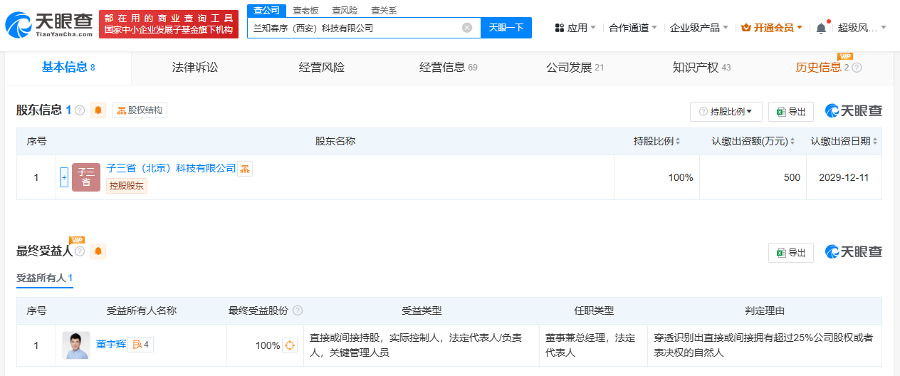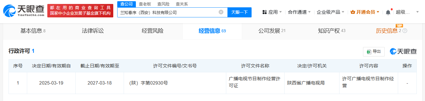每经AI快讯,天眼查App显示,近日,兰知春序(西安)科技有限公司新增广播电视节目制作经营许可证,许可机关为陕西省广播电视局。该公司成立于2024年12月,法定代表人为董宇辉,注册资本500万元人民币,经营范围包括互联网信息服务、网络文化经营、出版物零售、演出经纪、旅游业务、营业性演出等,由子三省(北京)科技有限公司全资持股。最终受益人信息显示,该公司实际控制人为董宇辉。