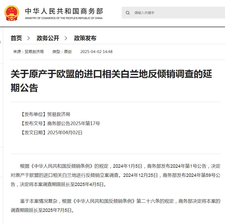 公告称,根据《中华人民共和国反倾销条例》的规定,2024年1月5日,商务部发布2024年第1号公告,决定对原产于欧盟的进口相关白兰地进行反倾销立案调查。2024年12月25日,商务部发布2024年第59号公告,决定将本案调查期限延长至2025年4月5日。鉴于本案情况复杂,根据《中华人民共和国反倾销条例》第二十六条的规定,商务部决定将本案的调查期限延长至2025年7月5日。