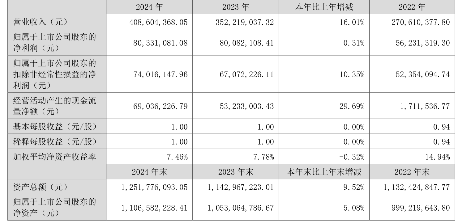 中证智能财讯星源卓镁(301398)4月3日披露2024年年度报告。2024年,公司实现营业总收入4.09亿元,同比增长16.01%;归母净利润8033.11万元,同比增长0.31%;扣非净利润7401.61万元,同比增长10.35%;经营活动产生的现金流量净额为6903.62万元,同比增长29.69%;报告期内,星源卓镁基本每股收益为1.00元,加权平均净资产收益率为7.46%。公司2024年度分配预案为:拟向全体股东每10股转4股,派现3.75元(含税)。