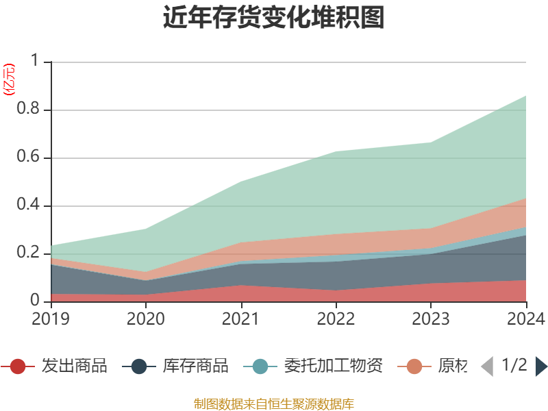 从存货变动来看,截至2024年末,公司存货账面价值为8575.33万元,占净资产的7.75%,较上年末增加1940.21万元。其中,存货跌价准备为428.48万元,计提比例为4.76%。
