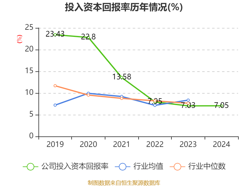 数据显示,2024年公司加权平均净资产收益率为7.46%,较上年同期下降0.32个百分点。公司2024年投入资本回报率为7.05%,较上年同期上升0.02个百分点。