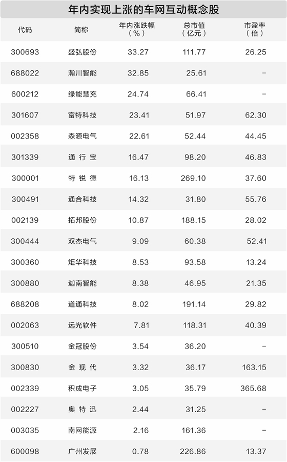据证券时报·数据宝统计,A股中布局车网互动的概念股共有27只,今年以来普遍上涨,平均累计涨幅达到7%,盛弘股份、瀚川智能、绿能慧充累计涨幅居前,分别为33.27%、32.85%、24.74%。