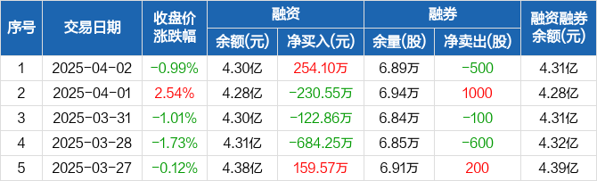 融资方面,当日融资买入1067.27万元,融资偿还813.18万元,融资净买入254.1万元。融券方面,融券卖出0股,融券偿还500股,融券余量6.89万股,融券余额55.12万元。融资融券余额合计4.31亿元。