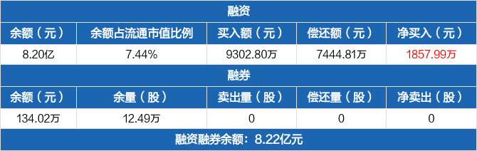 融资方面,当日融资买入9302.8万元,融资偿还7444.81万元,融资净买入1857.99万元。融券方面,融券卖出0股,融券偿还0股,融券余量12.49万股,融券余额134.02万元。融资融券余额合计8.22亿元。