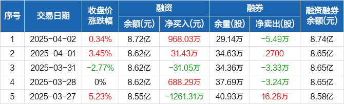 融资方面,当日融资买入2812.02万元,融资偿还1843.99万元,融资净买入968.03万元。融券方面,融券卖出5900股,融券偿还6.08万股,融券余量29.14万股,融券余额254.39万元。融资融券余额合计8.74亿元。
