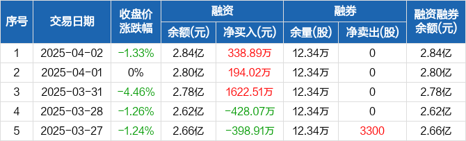 融资方面,当日融资买入1048.75万元,融资偿还709.86万元,融资净买入338.89万元,连续3日净买入累计2155.42万元。融券方面,融券卖出0股,融券偿还0股,融券余量12.34万股,融券余额18.26万元。融资融券余额合计2.84亿元。