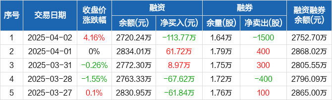 融资方面,当日融资买入202.37万元,融资偿还316.14万元,融资净偿还113.77万元。融券方面,融券卖出1900股,融券偿还3400股,融券余量1.64万股,融券余额32.46万元。融资融券余额合计2752.7万元。