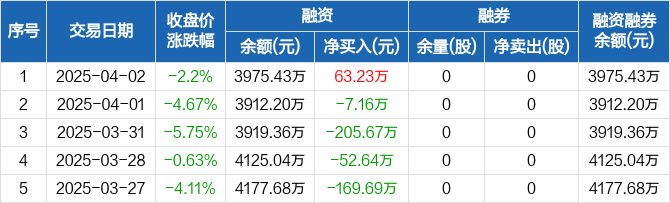 融资方面,当日融资买入135.99万元,融资偿还72.76万元,融资净买入63.23万元。融券方面,融券卖出0股,融券偿还0股,融券余量0股,融券余额0元。融资融券余额合计3975.43万元。