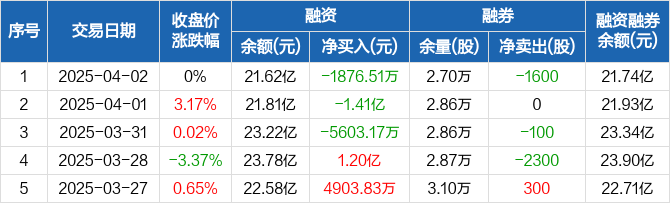 融资方面,当日融资买入8408.25万元,融资偿还1.03亿元,融资净偿还1876.51万元,连续3日净偿还累计2.16亿元。融券方面,融券卖出2000股,融券偿还3600股,融券余量2.7万股,融券余额1158.84万元。融资融券余额合计21.74亿元。