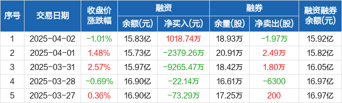 顺丰控股融资融券信息显示,2025年4月2日融资净买入1018.74万元;融资余额15.83亿元,较前一日增加0.65%。