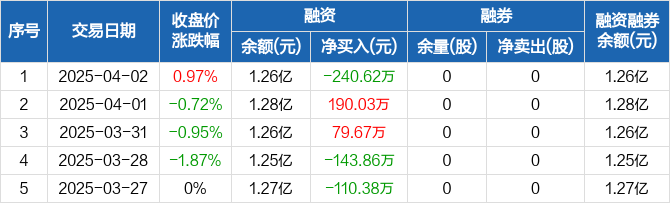融资方面,当日融资买入42.9万元,融资偿还283.52万元,融资净偿还240.62万元。融券方面,融券卖出0股,融券偿还0股,融券余量0股,融券余额0元。融资融券余额合计1.26亿元。