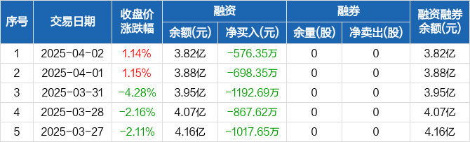 融资方面,当日融资买入2067.93万元,融资偿还2644.29万元,融资净偿还576.35万元,连续5日净偿还累计4352.66万元。融券方面,融券卖出0股,融券偿还0股,融券余量0股,融券余额0元。融资融券余额合计3.82亿元。